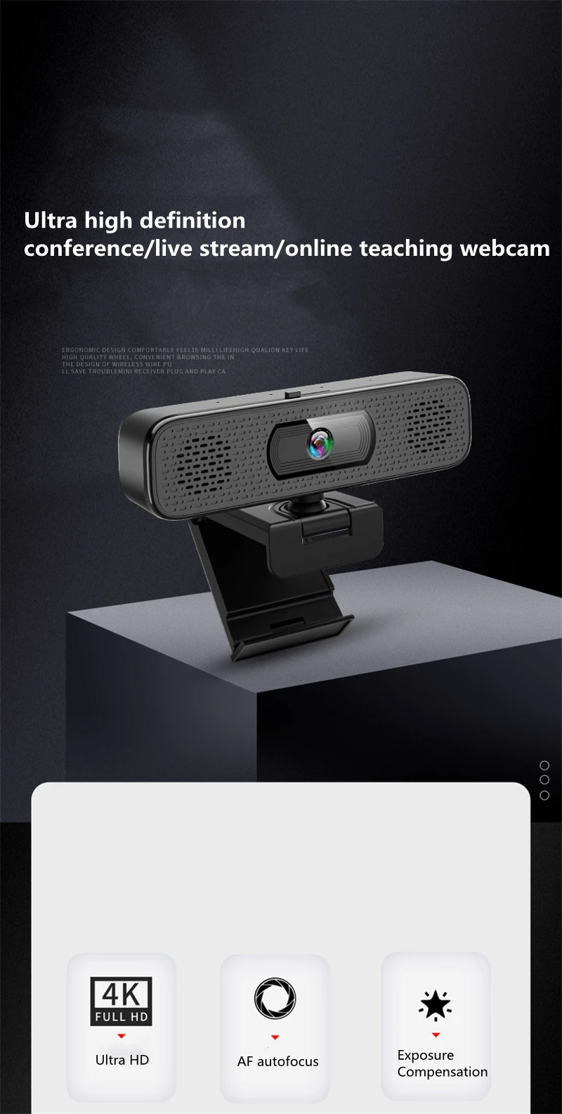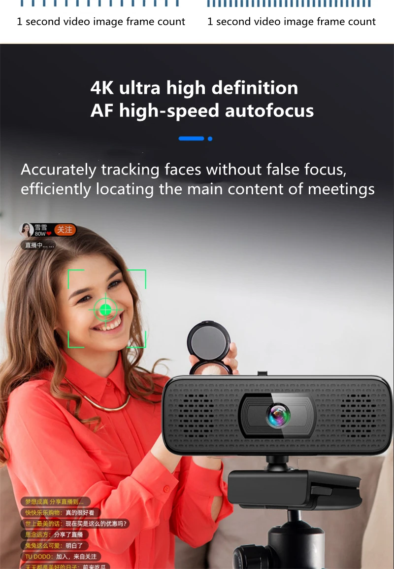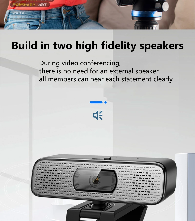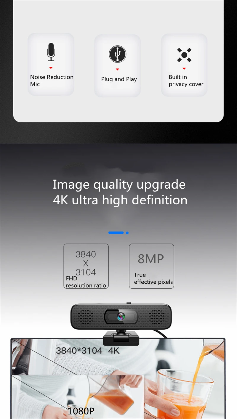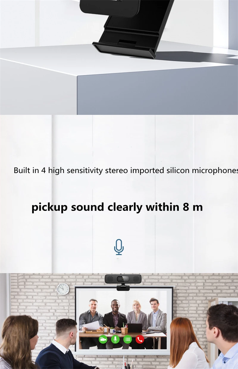 Compared with most webcams, this product has a huge difference. It has 4pcs built-in sound-absorbing microphones and 2 pcs high fidelity speakers,your voice can be heard clearly within 8 meters, which means you don't have to approach the webcam.With a resolution of 3840x2160,the real 8 megapixel allows you to enjoy a large screen.